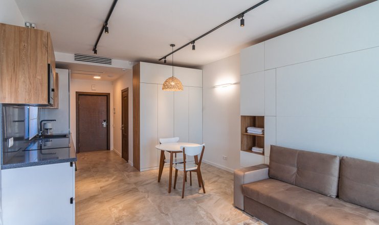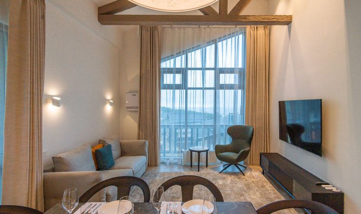 В номере: кухня, вешалка, диван, зеркало, кровать двуспальная, стол, стулья, шкаф, гладильная доска, кондиционер, микроволновая печь, набор посуды, посудомоечная машина, стиральная машина, телевизор, утюг, холодильник, чайный набор посуды, электрическая плита, электрочайник