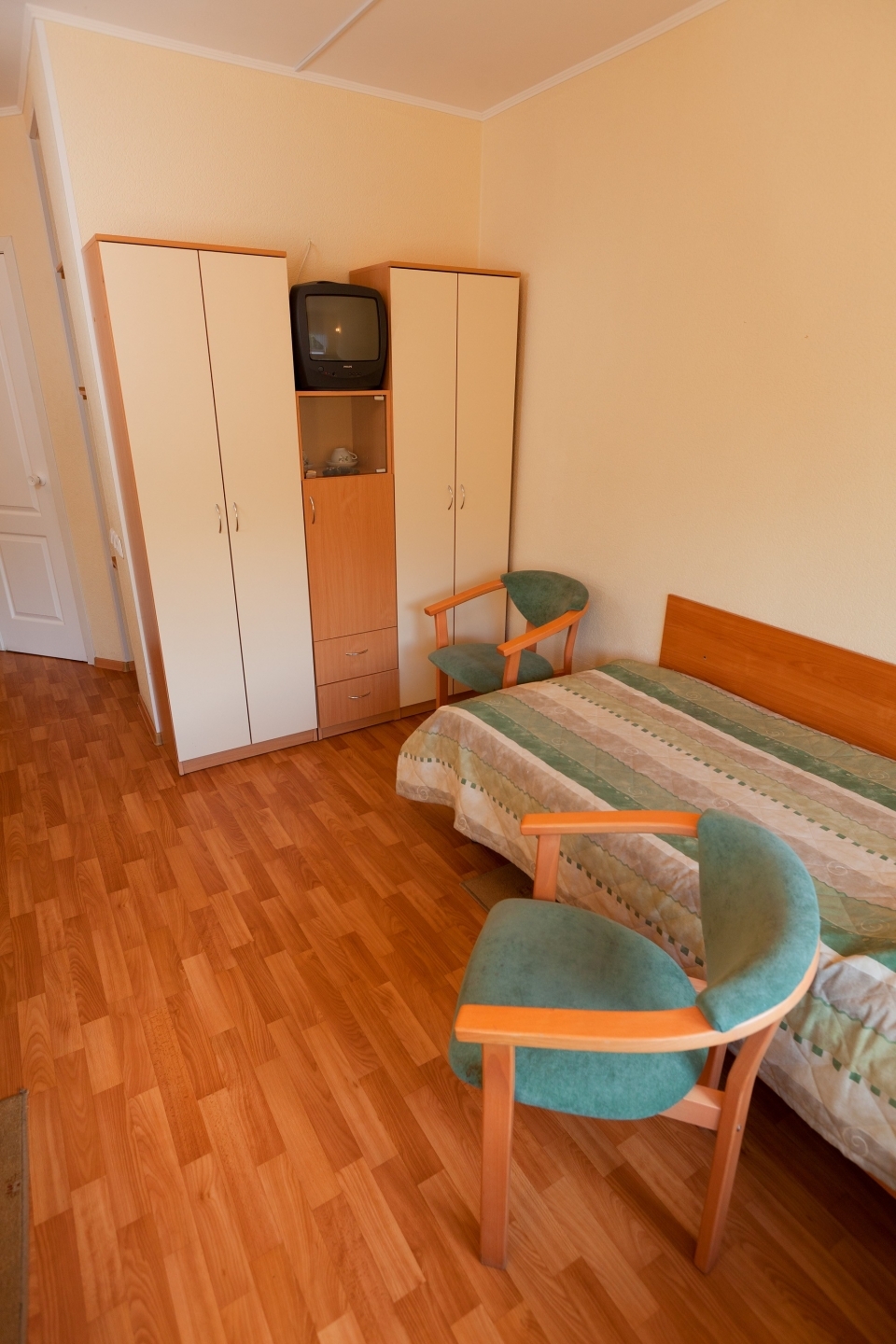 В номере: кровать, шкаф, стол, кресло, стулья, тумбочка, зеркало, телевизор, телефон, холодильник