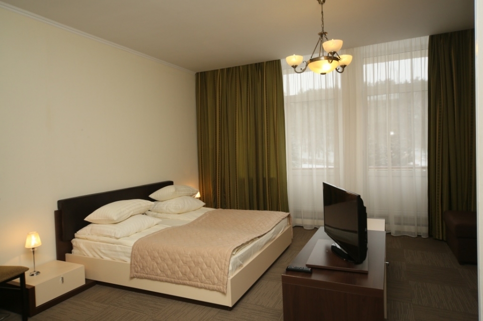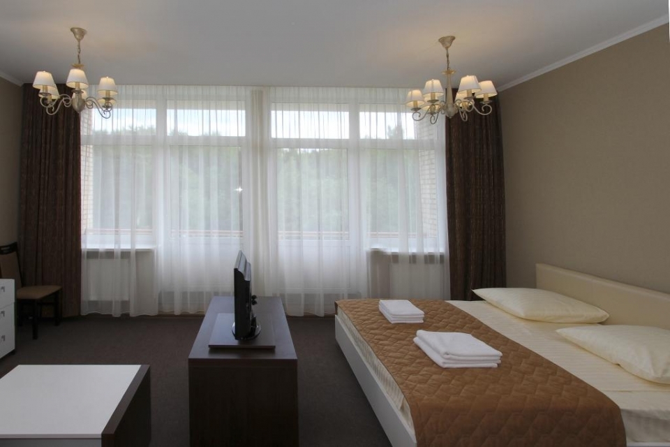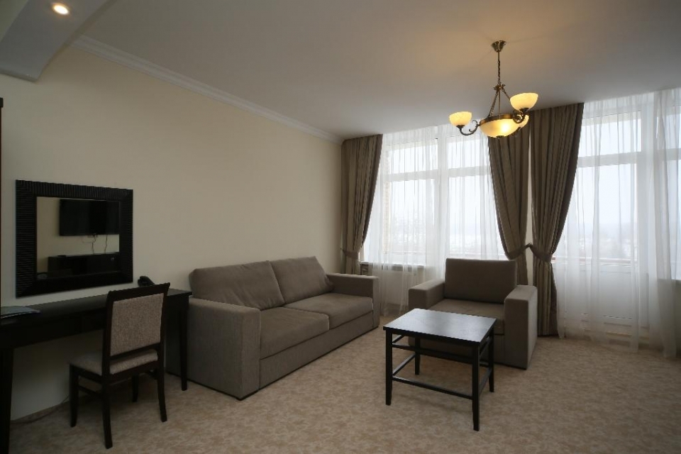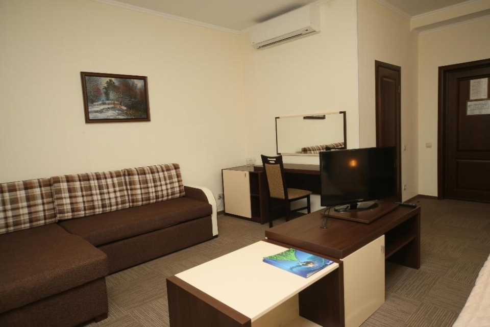 В номере: 2-спальная кровать 180х200, доп. место – большой раскладной диван. Второе дополнительное место – евро-раскладушка, мини-бар холодильник/мини-бар, телефон, телевизор, кабельное ТВ, Wi-Fi, набор посуды: графин для воды, 2 стакана, балкон, мини-сейф, предоставляются халат, тапочки. Для детей по запросу предоставляются детские кровати.